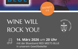 "Wine will rock you" mit der Bluesband "Red meets Blue" in unserem Gewölbekeller Ganz nach dem Motto "Wine Will Rock You" veranstalten wir auch 2026 wieder eine Wein-Tanz-Party in unserem Gewölbekeller. Am 14. März ist es soweit: Die Bluesband "Red meets Blue" bringt uns mal wieder ordentlich zum Swingen, Jazzen, Rocken, Tanzen und Feiern! [...]